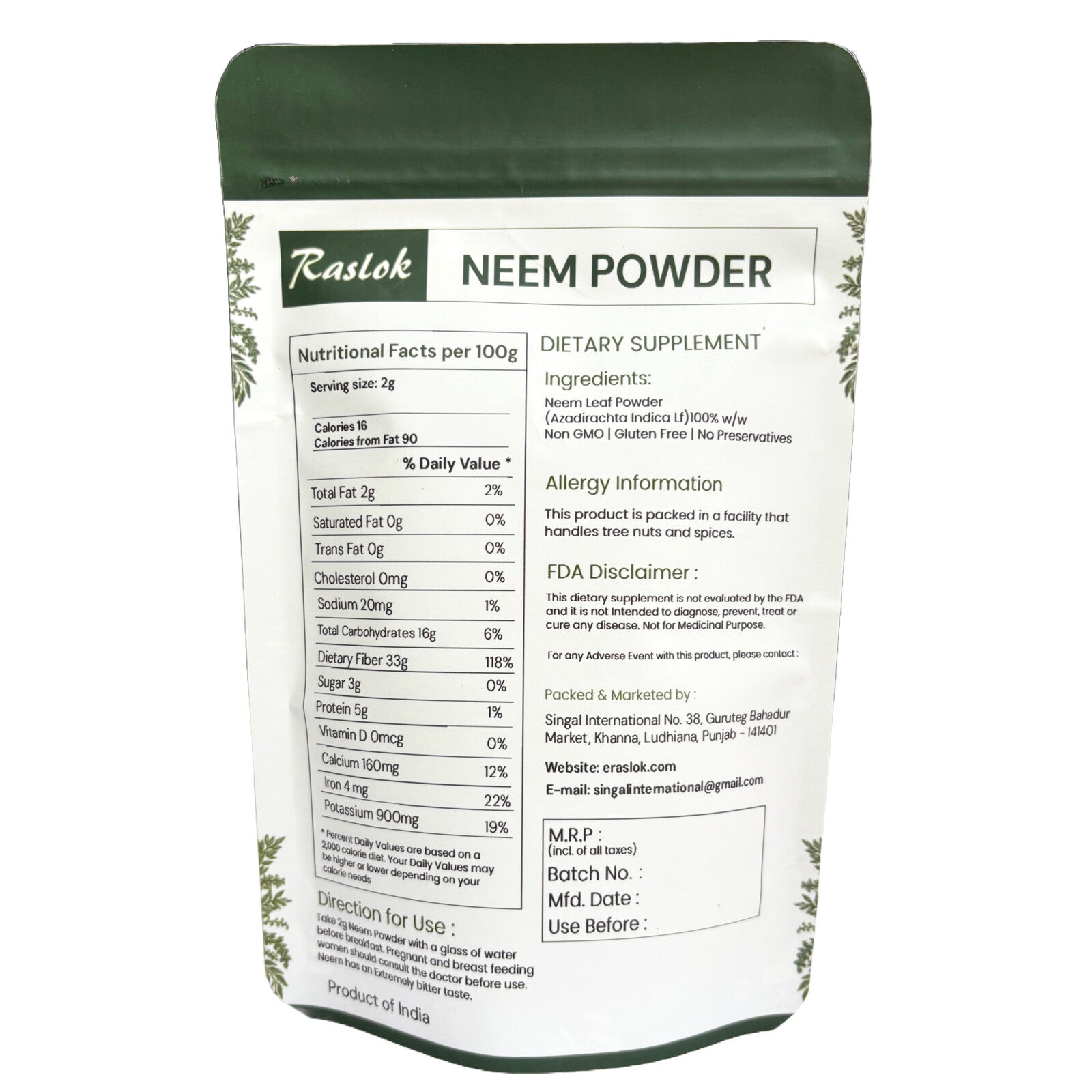 - 100% Pure and Natural: Raslok Neem Powder is an unadulterated gift from nature. It contains pure neem leaves, ground to perfection, without any additives or artificial ingredients. Experience the essence of neem in its most authentic form.